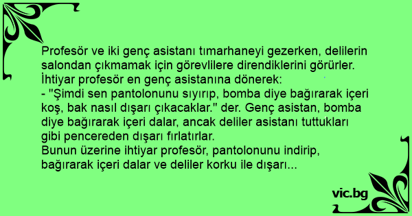 - "Şimdi sen pantolonunu sıyırıp, bomba diye bağırarak içeri koş, bak nasıl dışarı çıkacaklar." der. Genç asistan, bomba diye bağırarak içeri dalar, ancak deliler asistanı tuttukları gibi pencereden dışarı fırlatırlar.
