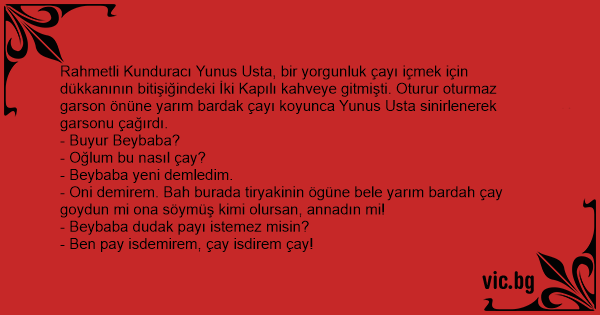 Rahmetli Kunduracı Yunus Usta, bir yorgunluk çayı içmek için dükkanının bitişiğindeki İki Kapılı kahveye gitmişti. Oturur oturmaz garson önüne yarım bardak çayı koyunca Yunus Usta sinirlenerek garsonu çağırdı.