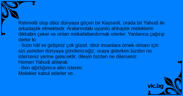 Rahmetli olup öbür dünyaya göçen bir Kayserili, orada bir Yahudi ile arkadaşlık etmektedir. Aralarındaki uyumlu ahbaplık meleklerin dikkatini çeker ve onları mükafatlandırmak isterler. Yanlarına çağırıp derler ki: