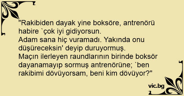 Maçın ilerleyen raundlarının birinde boksör dayanamayıp sormuş antrenörüne; `ben rakibimi dövüyorsam, beni kim dövüyor?"