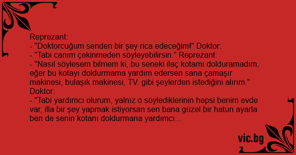 - "Nasıl söylesem bilmem ki, bu seneki ilaç kotamı dolduramadım, eğer bu kotayı doldurmama yardım edersen sana çamaşır makinesi, bulaşık makinesi, TV. gibi şeylerden istediğini alırım." Doktor: