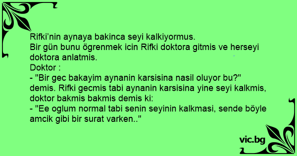 - "Bir gec bakayim aynanin karsisina nasil oluyor bu?" demis. Rifki gecmis tabi aynanin karsisina yine seyi kalkmis, doktor bakmis bakmis demis ki: