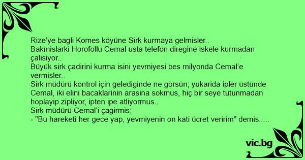 Sirk müdürü kontrol için gelediginde ne görsün; yukarida ipler üstünde Cemal, iki elini bacaklarinin arasina sokmus, hiç bir seye tutunmadan hoplayip zipliyor, ipten ipe atliyormus..