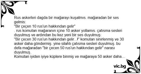 "Bir çecen 30 rus'un hakkından gelir...!" komutan sinirlenmiş ve 30 asker daha göndermiş. yine silahlı çatısma sesleri duyulmuş. bu defa mağaradan "bir çecen 50 rus'un hakkından gelir" narası duyulmuş.