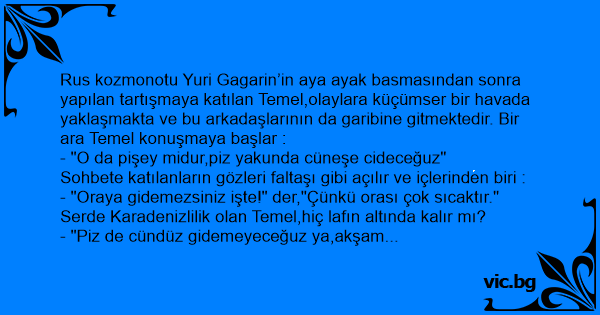 Rus kozmonotu Yuri Gagarin’in aya ayak basmasından sonra yapılan tartışmaya katılan Temel,olaylara küçümser bir havada yaklaşmakta ve bu arkadaşlarının da garibine gitmektedir. Bir ara Temel konuşmaya başlar :