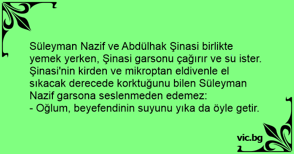 Süleyman Nazif ve Abdülhak Şinasi birlikte yemek yerken, Şinasi garsonu çağırır ve su ister. Şinasi'nin kirden ve mikroptan eldivenle el sıkacak derecede korktuğunu bilen Süleyman Nazif garsona seslenmeden edemez: