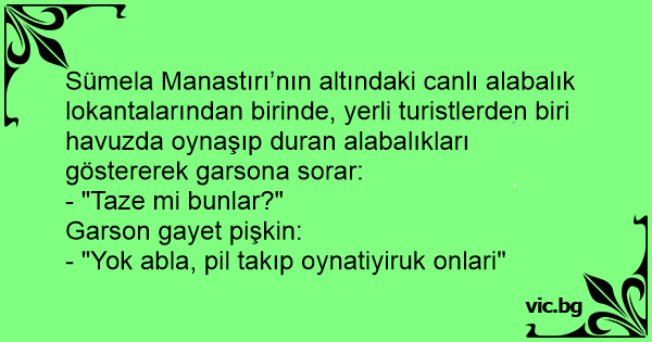 Sümela Manastırı’nın altındaki canlı alabalık lokantalarından birinde, yerli turistlerden biri havuzda oynaşıp duran alabalıkları göstererek garsona sorar: