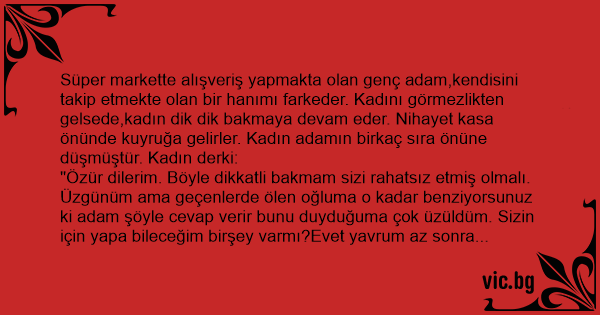 "Özür dilerim. Böyle dikkatli bakmam sizi rahatsız etmiş olmalı. Üzgünüm ama geçenlerde ölen oğluma o kadar benziyorsunuz ki adam şöyle cevap verir bunu duyduğuma çok üzüldüm. Sizin için yapa bileceğim birşey varmı?Evet yavrum az sonra eşyalarımı alıp çıkarken ne olur bana güle güle anne diye seslene bilirmisin?tabiki der genç adam. Yaşlı kadın çıkarken genç adam ona elsallar ve güle güle anne diye seslenir. Adam birisini mutlu etmenin mutluluğu içinde gülümser ve ödeme sırası kendine gelince kasanın 150 dolar yazdığını görür kasiyere sorar bu nasıl olur alt tarafı üç parça eşya aldım der. Kasiyer gayet sakin cevap verir "Anneniz hesabını sizin ödeyeceğinizi söyledi"