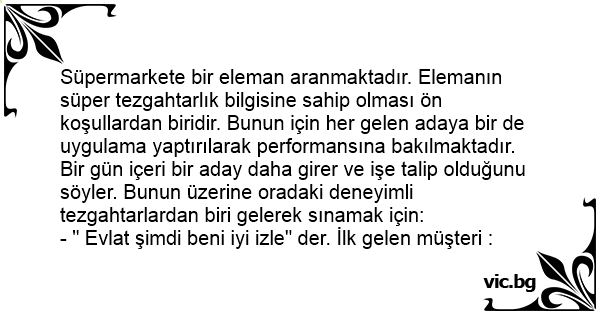 Süpermarkete bir eleman aranmaktadır. Elemanın süper tezgahtarlık bilgisine sahip olması ön koşullardan biridir. Bunun için her gelen adaya bir de uygulama yaptırılarak performansına bakılmaktadır. Bir gün içeri bir aday daha girer ve işe talip olduğunu söyler. Bunun üzerine oradaki deneyimli tezgahtarlardan biri gelerek sınamak için: