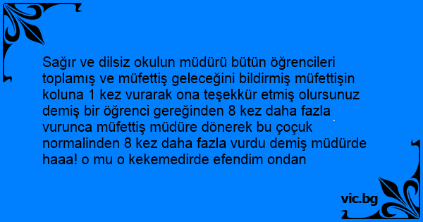 Sağır ve dilsiz okulun müdürü bütün öğrencileri toplamış ve müfettiş geleceğini bildirmiş müfettişin koluna 1 kez vurarak ona teşekkür etmiş olursunuz demiş bir öğrenci gereğinden 8 kez daha fazla vurunca müfettiş müdüre dönerek bu çoçuk normalinden 8 kez daha fazla vurdu demiş müdürde haaa! o mu o kekemedirde efendim ondan