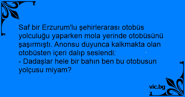Saf bir Erzurum'lu şehirlerarası otobüs yolculuğu yaparken mola yerinde otobüsünü şaşırmıştı. Anonsu duyunca kalkmakta olan otobüsten içeri dalıp seslendi: