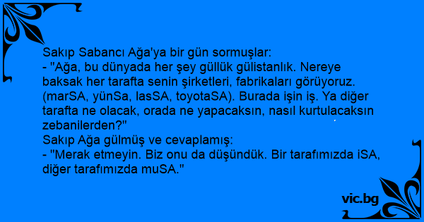 - "Ağa, bu dünyada her şey güllük gülistanlık. Nereye baksak her tarafta senin şirketleri, fabrikaları görüyoruz. (marSA, yünSa, lasSA, toyotaSA). Burada işin iş. Ya diğer tarafta ne olacak, orada ne yapacaksın, nasıl kurtulacaksın zebanilerden?"