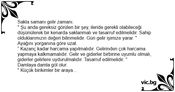 " İnsan iyi gününde parasını çarçur etmemeli, kötü gününü de düşünerek hareket etmelidir. Daha önce biriktirilen para sıkıntılı günlerde işe yarar. Bunun için tasarruf yapılmalıdır. Kısaca yerinde tasarruf, yerinde de harcama alışkanlığı kazanılmalıdır. "