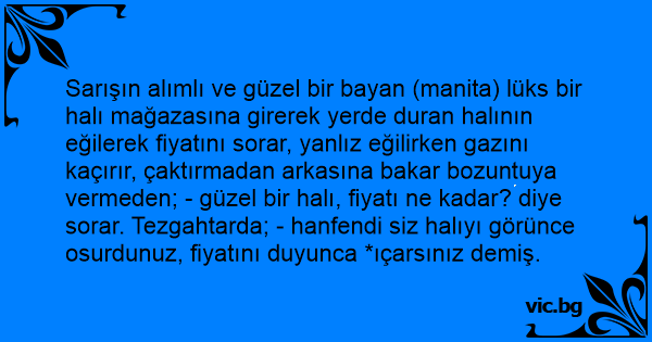 Sarışın alımlı ve güzel bir bayan (manita) lüks bir halı mağazasına girerek yerde duran halının eğilerek fiyatını sorar, yanlız eğilirken gazını kaçırır, çaktırmadan arkasına bakar bozuntuya vermeden; - güzel bir halı, fiyatı ne kadar? diye sorar. Tezgahtarda; - hanfendi siz halıyı görünce osurdunuz, fiyatını duyunca *ıçarsınız demiş.