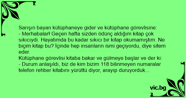 - Merhabalar! Geçen hafta sizden ödünç aldığım kitap çok sıkıcıydı. Hayatımda bu kadar sıkıcı bir kitap okumamıştım. Ne biçim kitap bu? İçinde hep insanların ismi geçiyordu, diye sitem eder.