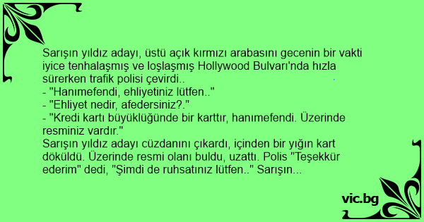 Sarışın yıldız adayı cüzdanını çıkardı, içinden bir yığın kart döküldü. Üzerinde resmi olanı buldu, uzattı. Polis "Teşekkür ederim" dedi, "Şimdi de ruhsatınız lütfen.." Sarışın mahçup mahçup sordu gene..