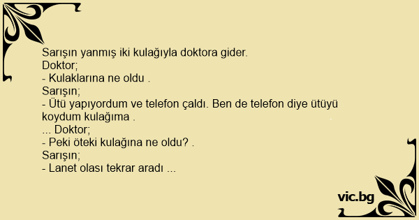 Две блондинки: - Муцка, защо са ти превързани и двете уши? - Оооф, вчера взех да гладя. Звъни ми телефона през това време... - И ти кво? - Вместо телефонът допрях ютията до ухото си... - Добре де,...