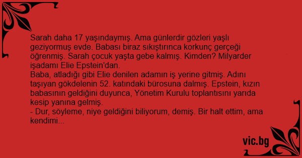 Sarah daha 17 yaşındaymış. Ama günlerdir gözleri yaşlı geziyormuş evde. Babası biraz sıkıştırınca korkunç gerçeği öğrenmiş. Sarah çocuk yaşta gebe kalmış. Kimden? Milyarder işadamı Elie Epstein'dan.