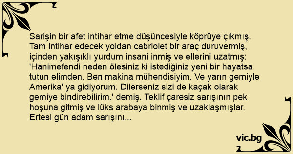 Sarişin bir afet intihar etme düşüncesiyle köprüye çıkmış. Tam intihar edecek yoldan cabriolet bir araç duruvermiş, içinden yakışıklı yurdum insani inmiş ve ellerini uzatmış: