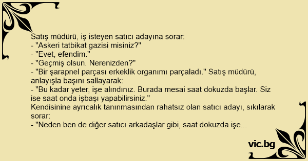 - "Bir şarapnel parçası erkeklik organımı parçaladı." Satış müdürü, anlayışla başını sallayarak: