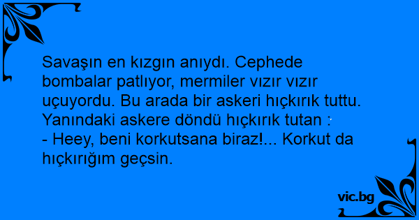 Savaşın en kızgın anıydı. Cephede bombalar patlıyor, mermiler vızır vızır uçuyordu. Bu arada bir askeri hıçkırık tuttu. Yanındaki askere döndü hıçkırık tutan :<br />- Heey, beni korkutsana biraz!... Korkut da hıçkırığım geçsin.
