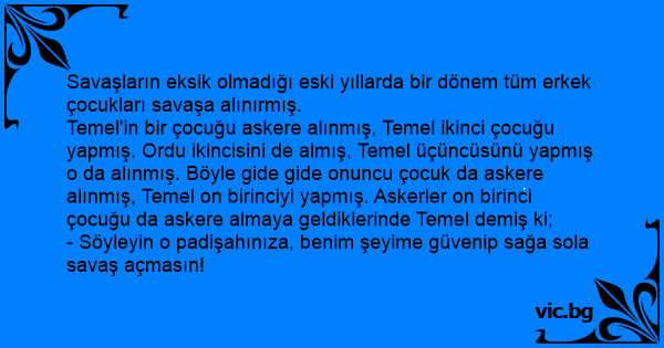 Temel'in bir çocuğu askere alınmış, Temel ikinci çocuğu yapmış. Ordu ikincisini de almış, Temel üçüncüsünü yapmış o da alınmış. Böyle gide gide onuncu çocuk da askere alınmış, Temel on birinciyi yapmış. Askerler on birinci çocuğu da askere almaya geldiklerinde Temel demiş ki;