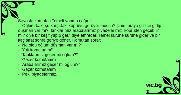 - "Oğlum bak, şu karşıdaki köprüyü görüyor musun? şimdi oraya gizlice gidip düşman var mı? tanklarımız arabalarımız piyadelerimiz, köprüden geçebilir mi? diye bir keşif yapıp gel." diye emreder. Temel sürüne sürüne gider ve bir kaç saat sonra geriye döner. Komutan sorar: