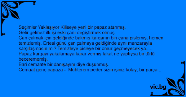 Cemaat genç papaza - Muhterem peder sizin işiniz kolay; bir parça peynir, peynirin yanına da bir kadeh rakı koy yakalarsınız iş biter demiş Papaz hayretle - Nasıl olur mu öyle şey!.. demiş.
