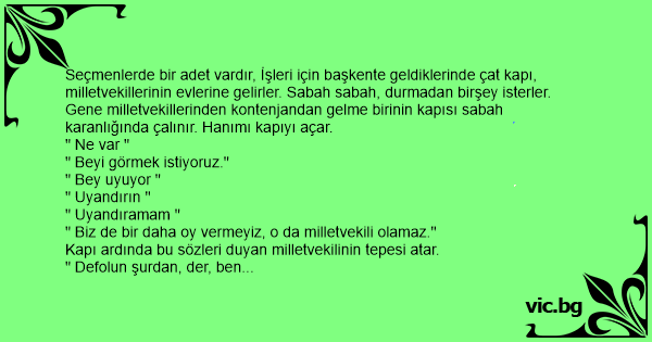 Seçmenlerde bir adet vardır, İşleri için başkente geldiklerinde çat kapı, milletvekillerinin evlerine gelirler. Sabah sabah, durmadan birşey isterler.