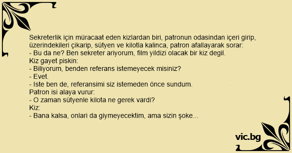Sekreterlik için müracaat eden kizlardan biri, patronun odasindan içeri girip, üzerindekileri çikarip, sütyen ve kilotla kalinca, patron afallayarak sorar: