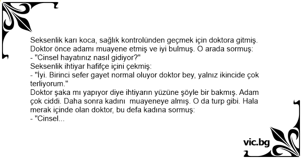 Doktor şaka mı yapıyor diye ihtiyarın yüzüne şöyle bir bakmış. Adam çok ciddi. Daha sonra kadını muayeneye almış. O da turp gibi. Hala merak içinde olan doktor, bu defa kadına sormuş: