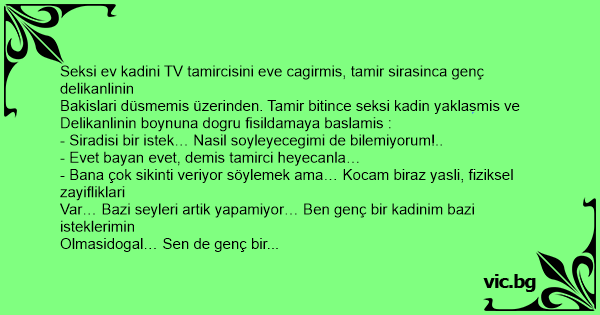 Един телевизионен техник бил повикан в една къща. Но домакинята била толкова красива, че човекът не можел да свали очи от нея.