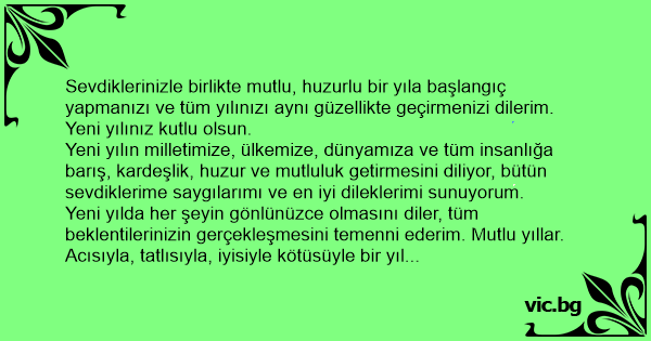 Sevgi bestesinin tınılarını tüm insanların yüreğinde hissedeceği, hüzünlerinizin dostluklarla silineceği, ümitlerinizin hiç bitmeyeceği, sağlık, mutluluk ve başarı dolu bir yılı sevdiklerinizle birlikte geçirmeniz dileğiyle. Yeni yıl size sağlık, mutluluk, başarı ve bol kazanç getirsin! Neşe dolu bir yıl geçirin!