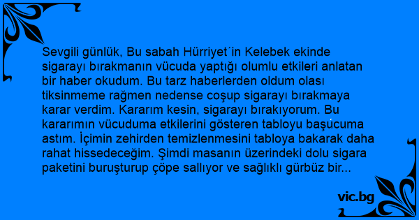 Sevgili günlük, Bu sabah Hürriyet´in Kelebek ekinde sigarayı bırakmanın vücuda yaptığı olumlu etkileri anlatan bir haber okudum. Bu tarz haberlerden oldum olası tiksinmeme rağmen nedense coşup sigarayı bırakmaya karar verdim. Kararım kesin, sigarayı bırakıyorum. Bu kararımın vücuduma etkilerini gösteren tabloyu başucuma astım. İçimin zehirden temizlenmesini tabloya bakarak daha rahat hissedeceğim. Şimdi masanın üzerindeki dolu sigara paketini buruşturup çöpe sallıyor ve sağlıklı gürbüz bir kişi olma yolundaki ilk adımımı atıyorum.