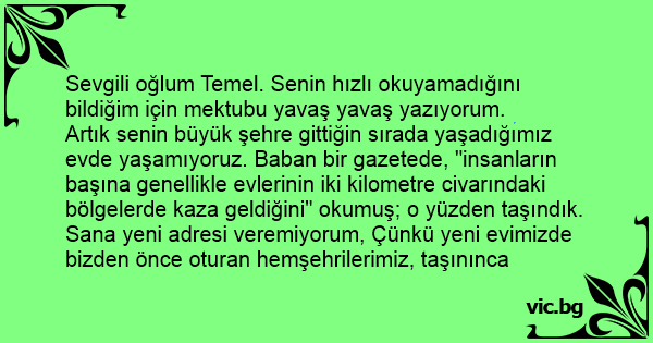 Sevgili oğlum Temel. Senin hızlı okuyamadığını bildiğim için mektubu yavaş yavaş yazıyorum.