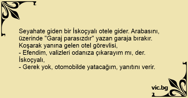 Seyahate giden bir İskoçyalı otele gider. Arabasını, üzerinde "Garaj parasızdır" yazan garaja bırakır. Koşarak yanına gelen otel görevlisi,