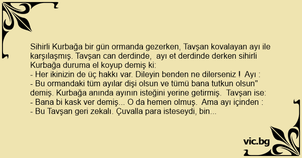 - Bu Tavşan geri zekalı. Çuvalla para isteseydi, bin tane kask alırdı. demiş. Kurbağa ikinci isteklerini sormuş. Ayı (babası da ayıymış zaten!):
