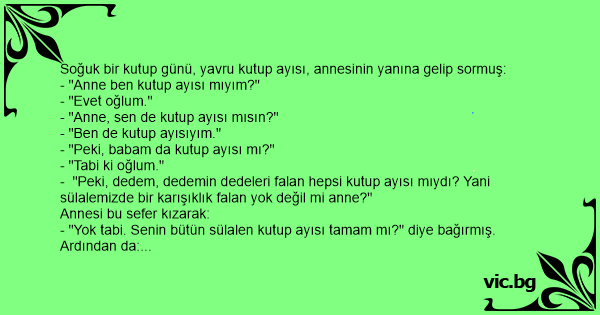 -  "Peki, dedem, dedemin dedeleri falan hepsi kutup ayısı mıydı? Yani sülalemizde bir karışıklık falan yok değil mi anne?"