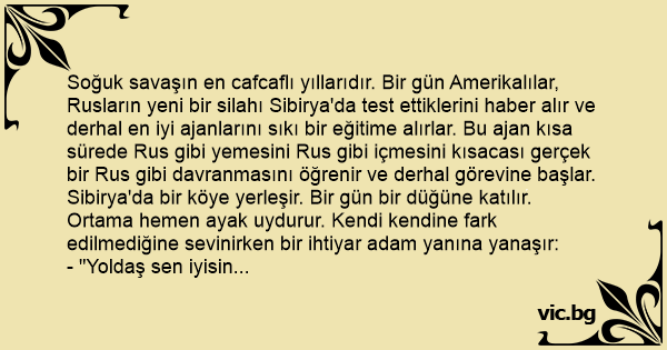 - "Yoldaş sen iyisin hoşsun ama Amerikalısın" der. Ajan şaşırır ama bozuntuya vermek istemez ve:
