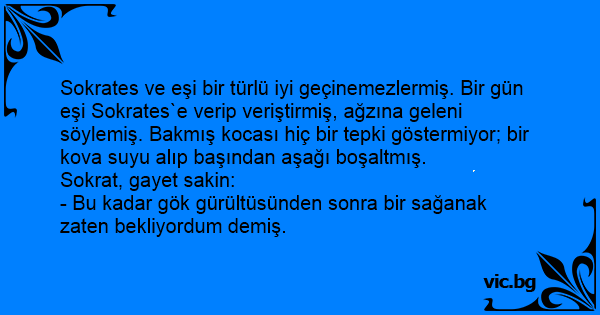 Sokrates ve eşi bir türlü iyi geçinemezlermiş. Bir gün eşi Sokrates`e verip veriştirmiş, ağzına geleni söylemiş. Bakmış kocası hiç bir tepki göstermiyor; bir kova suyu alıp başından aşağı boşaltmış.