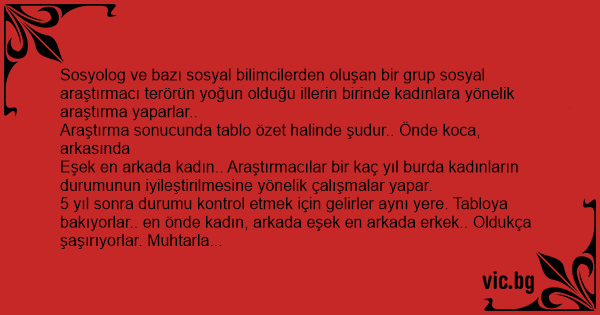 5 yıl sonra durumu kontrol etmek için gelirler aynı yere. Tabloya bakıyorlar.. en önde kadın, arkada eşek en arkada erkek.. Oldukça şaşırıyorlar. Muhtarla konuşuyorlar..
