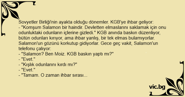 - "Komşum Salamon bir haindir. Devletten elmaslarını saklamak için onu odunluktaki odunların içlerine gizledi." KGB anında baskın düzenliyor, bütün odunları kırıyor, ama ihbar yanlış, bir tek elmas bulamıyorlar.