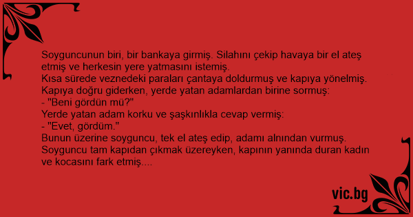 Soyguncunun biri, bir bankaya girmiş. Silahını çekip havaya bir el ateş etmiş ve herkesin yere yatmasını istemiş.