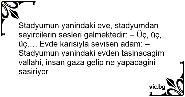 Stadyumun yanindaki eve, stadyumdan seyircilerin sesleri gelmektedir: – Üç, üç, üç…. Evde karisiyla sevisen adam: – Stadyumun yanindaki evden tasinacagim vallahi, insan gaza gelip ne yapacagini sasiriyor.