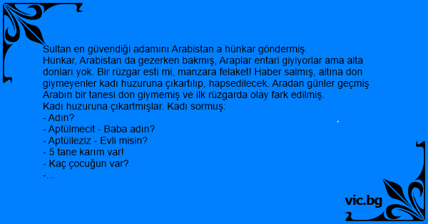 Hünkar, Arabistan da gezerken bakmış, Araplar entari giyiyorlar ama alta donları yok. Bir rüzgar еsтi mi, manzara felaket! Haber salmış, altına don giymeyenler kadı huzuruna çıkartılıp, hapsedilecek. Aradan günler geçmiş Arabın bir tanesi don giymemiş ve ilk rüzgarda olay fark edilmiş.