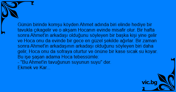 Günün birinde komşu köyden Ahmet adında biri elinde hediye bir tavukla çıkagelir ve o akşam Hocanın evinde misafir olur. Bir hafta sonra Ahmet'in arkadaşı olduğunu söyleyen bir başka kişi yine gelir ve Hoca onu da evinde bir gece en güzel şekilde ağırlar. Bir zaman sonra Ahmet'in arkadaşının arkadaşı olduğunu söyleyen biri daha gelir, Hoca onu da sofraya oturtur ve önüne bir kase sıcak su koyar. Bu işe şaşan adama Hoca tebessümle: