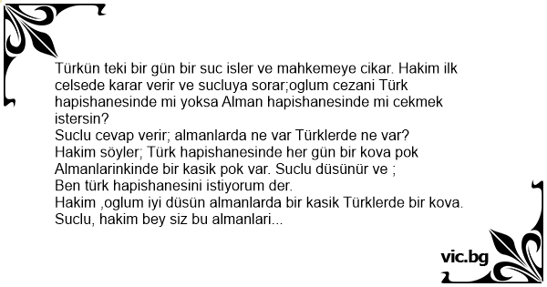 Türkün teki bir gün bir suc isler ve mahkemeye cikar. Hakim ilk celsede karar verir ve sucluya sorar;oglum cezani Türk hapishanesinde mi yoksa Alman hapishanesinde mi cekmek istersin?