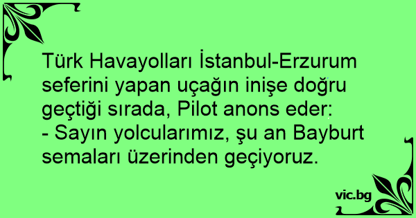 Türk Havayolları İstanbul-Erzurum seferini yapan uçağın inişe doğru geçtiği sırada, Pilot anons eder: