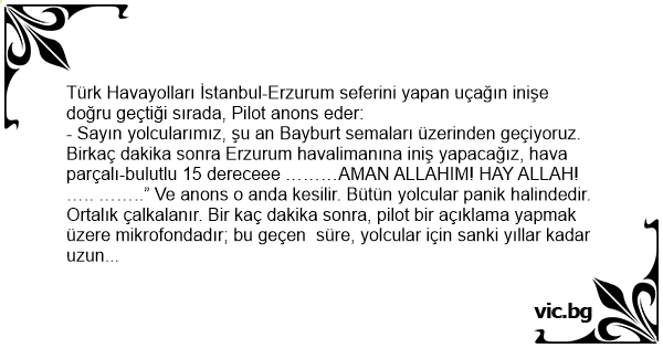 Birkaç dakika sonra Erzurum havalimanına iniş yapacağız, hava parçalı-bulutlu 15 dereceee ………AMAN ALLAHIM! HAY ALLAH!….. ……..” Ve anons o anda kesilir. Bütün yolcular panik halindedir. Ortalık çalkalanır. Bir kaç dakika sonra, pilot bir açıklama yapmak üzere mikrofondadır; bu geçen süre, yolcular için sanki yıllar kadar uzun sürmüştür. Pilot: