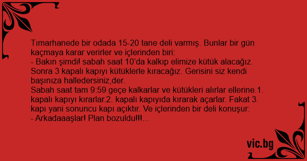 Tımarhanede bir odada 15-20 tane deli varmış. Bunlar bir gün kaçmaya karar verirler ve içlerinden biri: